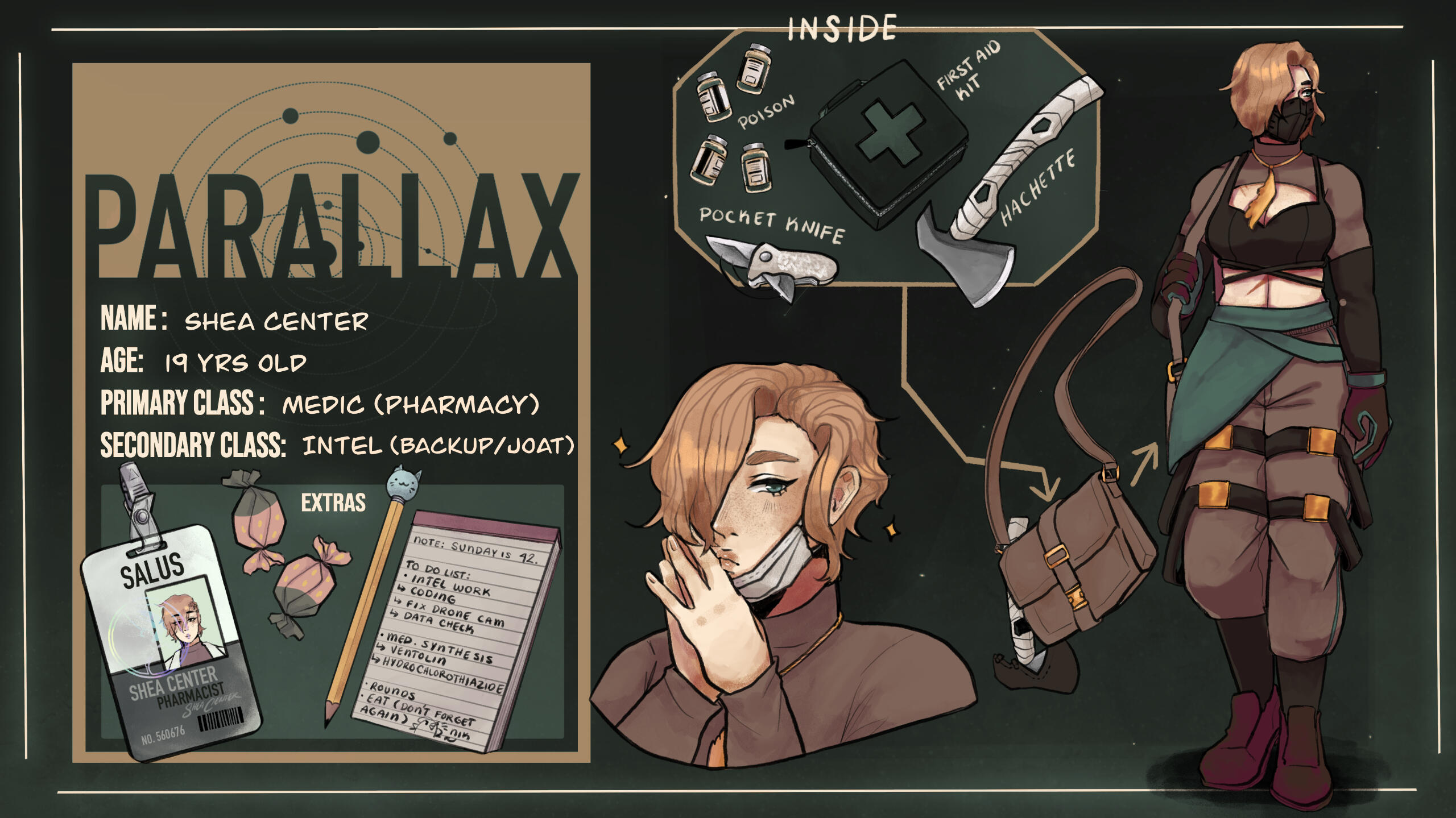 Shea was in a notorious scavenging group nicknamed “Vulture”, that would steal from colonies to survive. At six years old she was adopted along with her fifteen year old mentor (Krisko) by two Vulcan members, Melanie and Kole after a failed scouting mission. Over the next few years she becomes determined to assist the settlement in any way she can. Her interest led Kole to suggest helping them out in the infirmary. There she found a passion in comforting the sick, assisting the dying, and medicine making. Unfortunately she had also become the apprentice to the Head of Pharmacy, who is a raging narcissist. This shaped how she viewed herself as an individual and her current workflow.